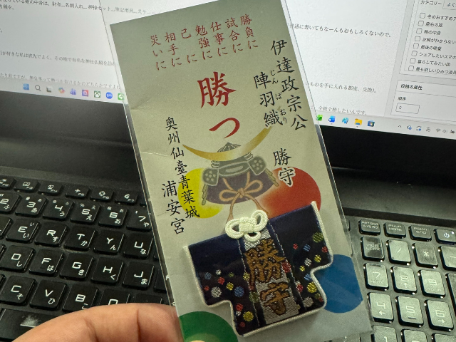 旅行が好きな私は旅先でよく、その地で有名な神社仏閣を訪れるんですが、各地で「勝守」を手に入れては、一番よく使う仕事の鞄に入れています(新しいものを手に入れる都度、交換)。