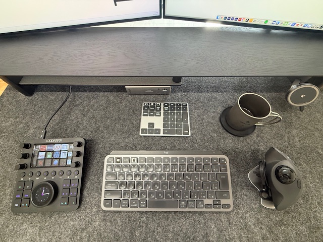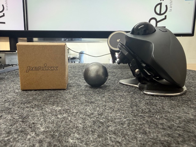 ・マウスはロジクール MX ERGO。ショートカット10個以上仕込んでいるので、もうこれ以外は触れない。マウスを思いっきりチルトするためのベースキットを3Dプリンターで自作している人から購入(疲労対策)。当然トラックボールは、動きが滑らかなペリックスに交換。