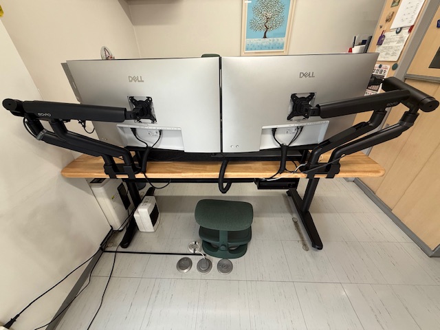 基本的にCOFOの昇降デスクにデュアルアームを2セット。左2面でWindows、右2面でMacという構成。