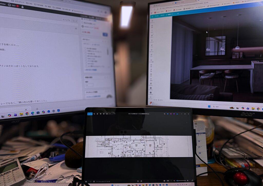 とはいえ一応、現代人らしくMicrosoft Surfaceにディスプレイを2台並べ、設計やデザインはそれっぽくこなしておりますが…