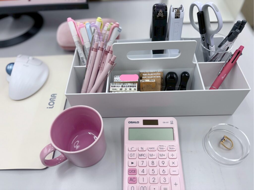 季節柄、文房具類をピンクの小物でまとめてみました。