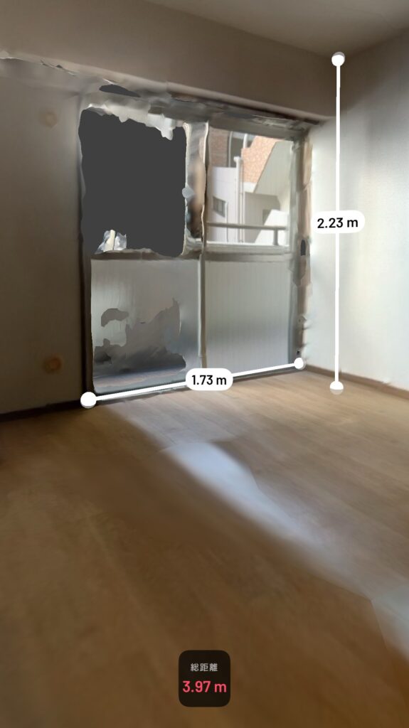 スキャンすると天井高さや窓の幅、cm単位でどこでも確認可能。