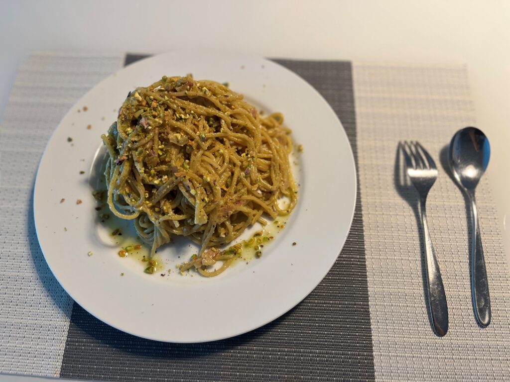 ピスタチオを時間をかけて丁寧にペーストにし、パスタ1本1本にしっかり絡ませ、最後に近所に迷惑をかけない程度の音で優しく砕いたピスタチオとエクストラバージンオリーブオイルをふんだんにかけた逸品。ここは知る人はほとんどいない隠れた名店。ネットにも情報のない気まぐれのコック。ふふふ。
