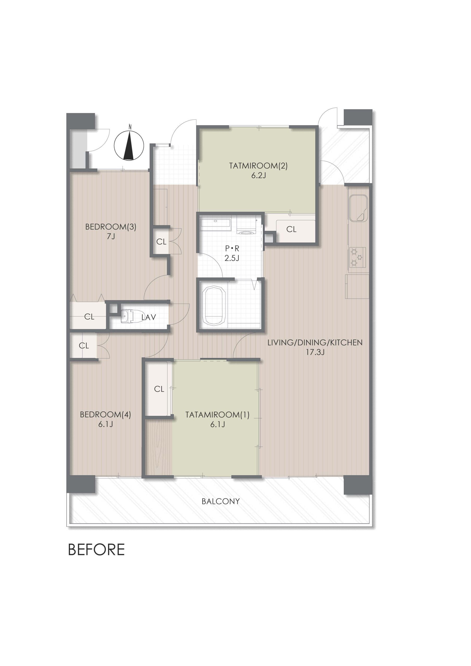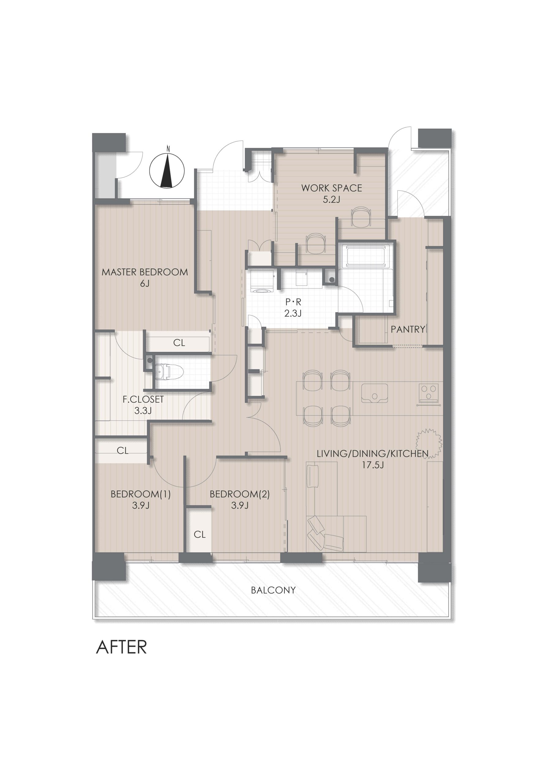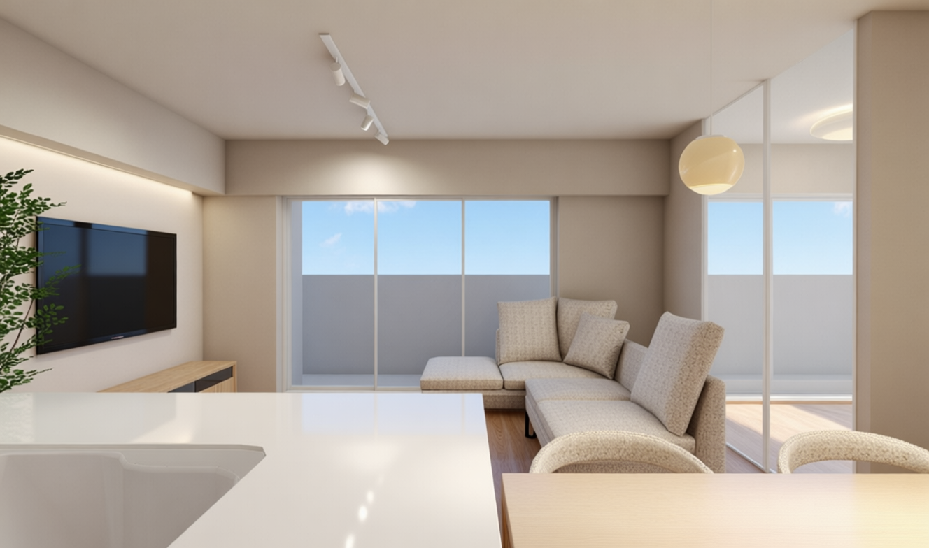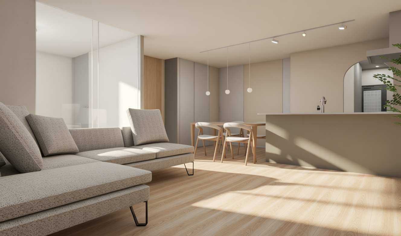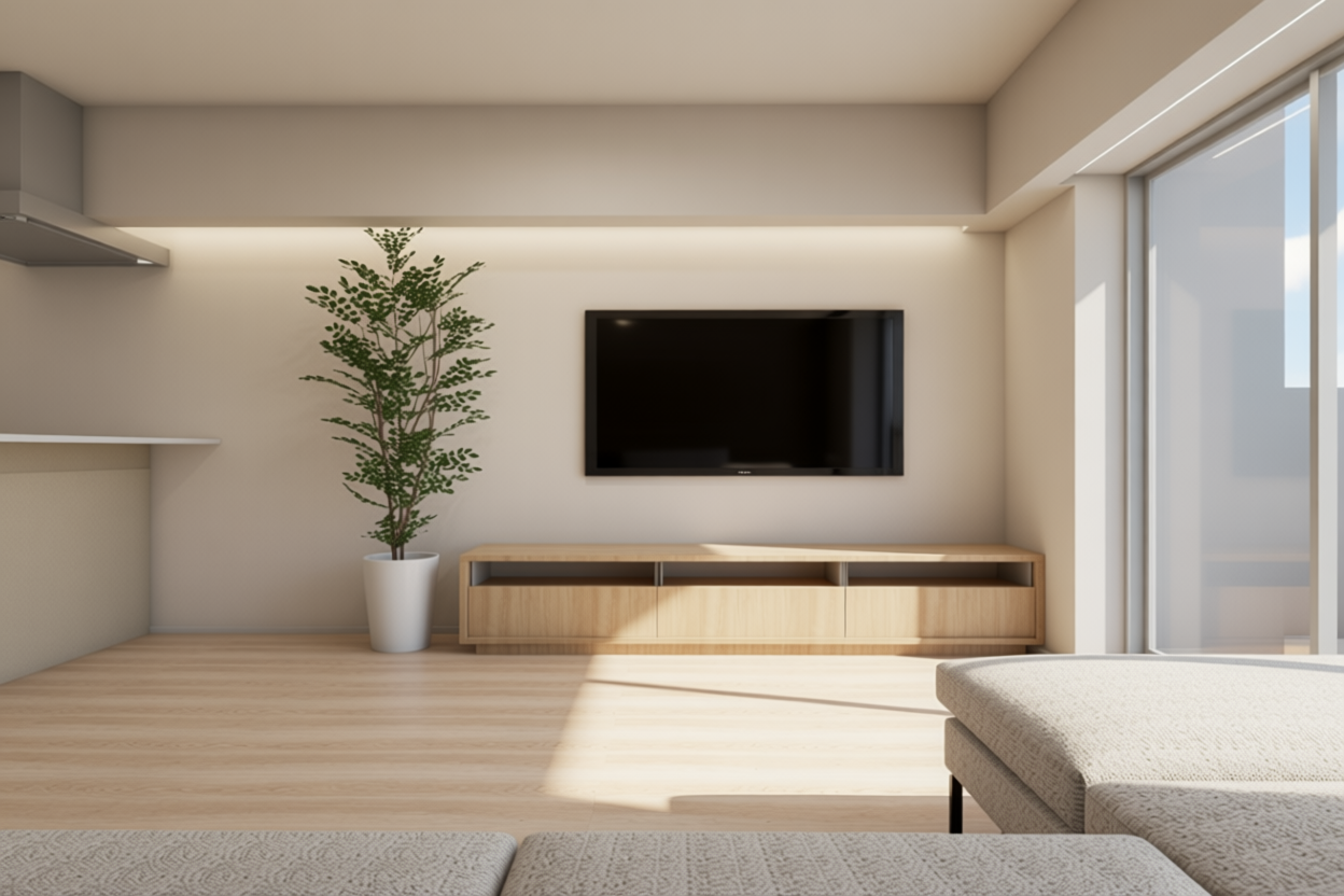 ベージュのやわらかなトーンと木の温もりが重なり合い、心地よく過ごせる空間をつくり出しています。